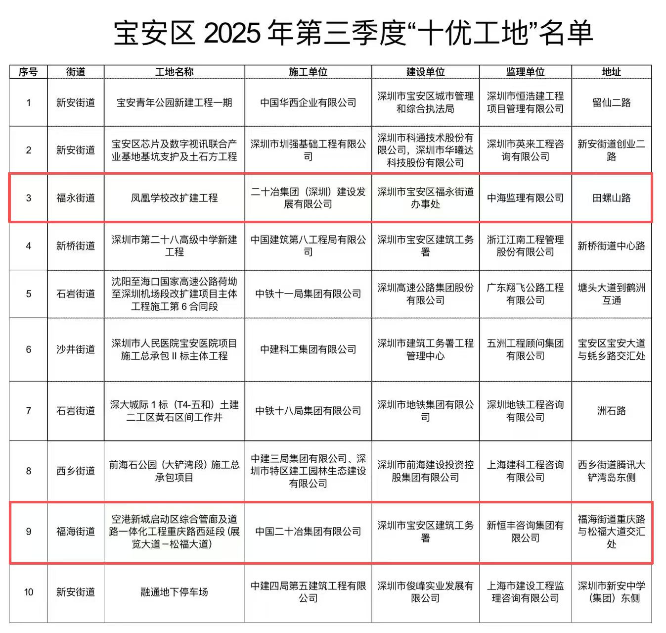 深圳二十冶兩項目榮獲深圳市寶安區“十優工地”稱號
