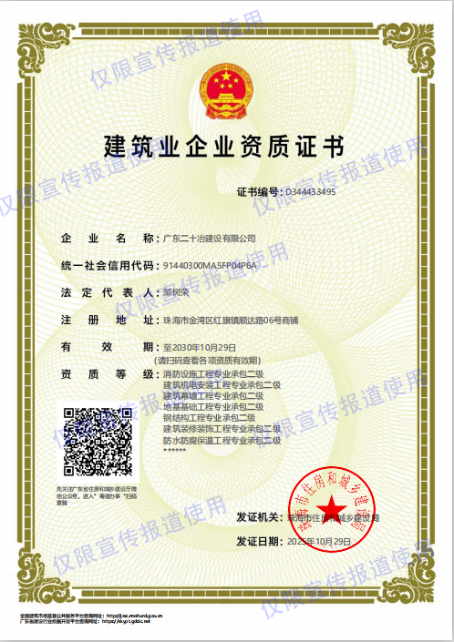10月29日,廣東二十冶申報的七項專業承包二級資質,經珠海市住房和城鄉建設局審查通過,成功實現有效期延續五年,為公司持續深耕建筑領域注入強勁動力。