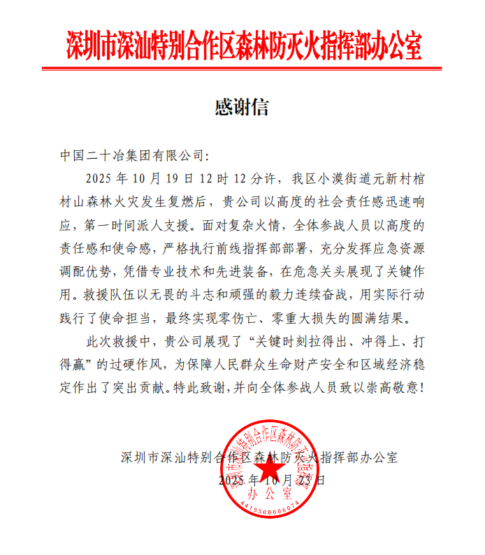 11月6日,深圳二十冶收到深圳市深汕特別合作區森林防滅火指揮部辦公室發來的感謝信,信中對公司保障人民群眾生命財產安全和區域經濟穩定作出的貢獻予以肯定。