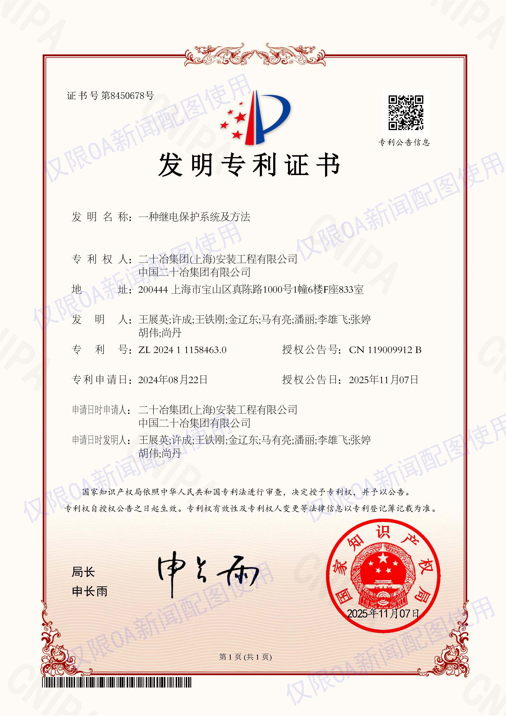 11月7日,經國家知識產權局審批,安裝公司智大電子事業部研發申報的《一種繼電保護系統及方法》發明專利獲得國家知識產權局授權證書。